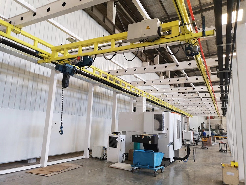 2.柔性組合式懸掛起重機(jī)自重特別輕,滑輪與軌道之間的摩擦力很小,操作輕便,可以很輕松的用手移動,能夠很迅速的輸送搬運(yùn)那些不太方便的輕小型的物件。系統(tǒng)配備的環(huán)鏈電動葫蘆及其行走驅(qū)動裝置,電器控制裝置和配套系統(tǒng),確保系統(tǒng)工作壽命長,無故障,免維護(hù)。